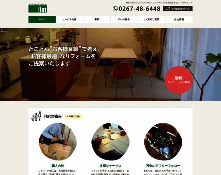 「株式会社フラット」は、首都圏でリフォーム・リノベーションをご提供している会社です。品質最優先のきめ細やかな施工をお客様にお届けすること、そして費用の「安さ」よりも「仕上がりの良さ」や「技術の高さ」でご満足いただくことを信条として、日々業務にあたっています。