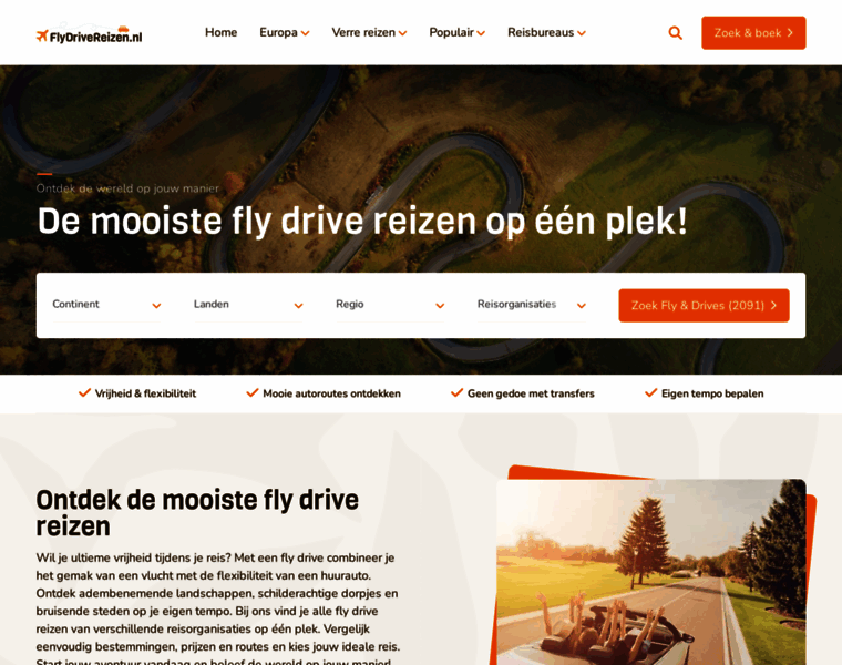 Een fly drive boeken? Op FlyDriveReizen.nl vergelijkt u de fly drives van alle reisbureaus naar de mooiste bestemmingen. Vergelijk & boek al v.a. 189,-!
