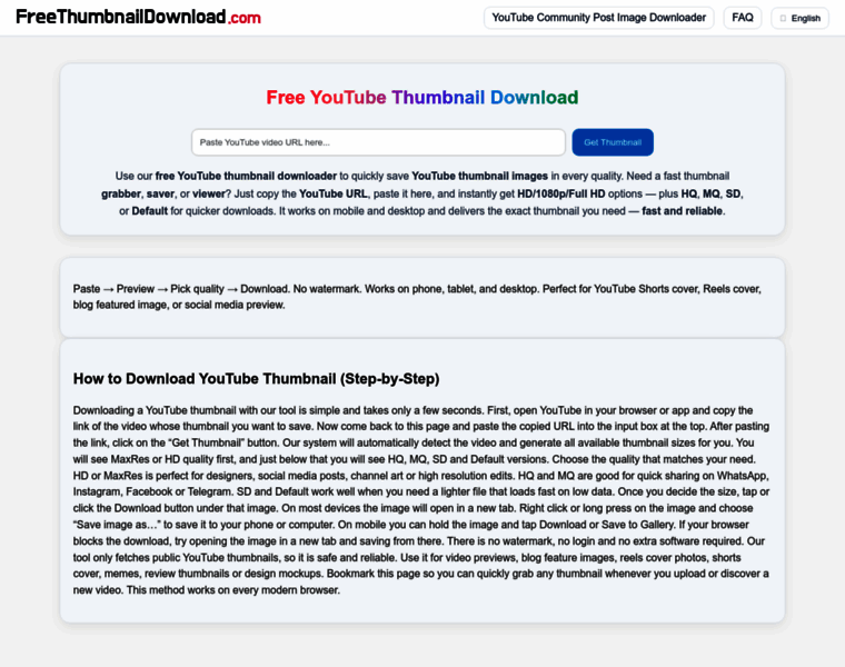 Free YouTube Thumbnail Downloader. Paste a YouTube video URL to instantly preview and download MaxRes (HD), SD, HQ, MQ, and default thumbnails.