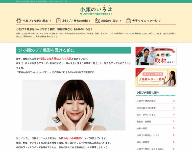 小顔プチ整形の施術やクリニック情報をまとめたサイトです。注射、糸リフト、マシンの3種類に分けてわかりやすくご紹介し、取り扱いクリニックの詳細や料金も調査。事前に知っておきたい危険性や注意点も掲載していますので、ぜひご参考にして下さい。