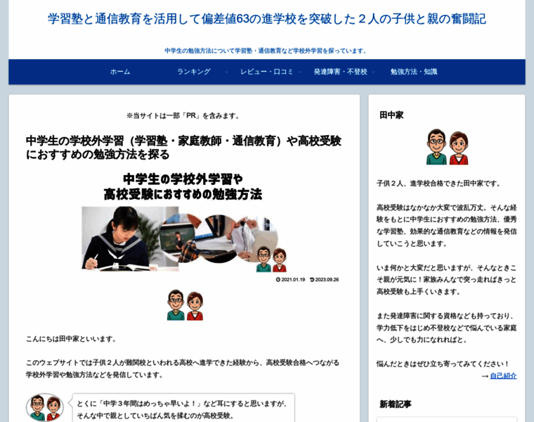 子供2人が進学校へ合格できた経験をもとに、中学生におすすめの勉強方法・通信教育・学習塾などを網羅的に発信します。英検・英会話・プログラミングなど関連学習、高校受験にむけ効果的な学習方法を追求しています。