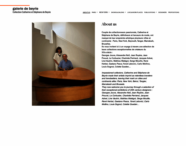 Famous Antique Dealers, Catherine and Stephane de Beyrie, created in 1989, Galerie de Beyrie specialized in XX Century French Decorative Arts. From Paris to New York and Beirut, these "Travelling Antique Dealers", present Major French Designers: Georges Jouve, Jean Royère, Alexandre Noll, Jean Prouvé,Charlotte Perriand, Serge Mouille, Jacques Adnet and Le Corbusier.