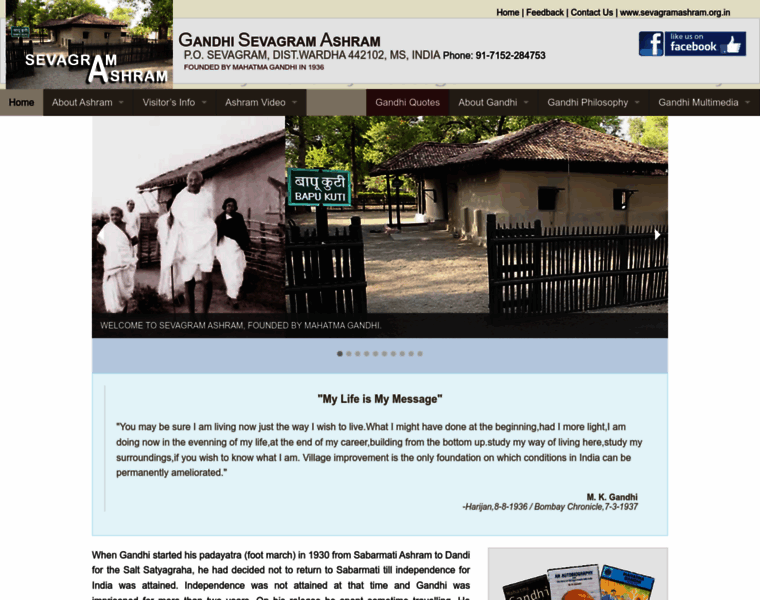 Welcome to Official website of Mahatma Gandhi's Sevagram Ashram. Gandhi Ashram established by M.K.Gandhi in India, Complete information about Mahatma Gandhi's life, his ashram life and activities. The largest collection of Gandhian literature.
