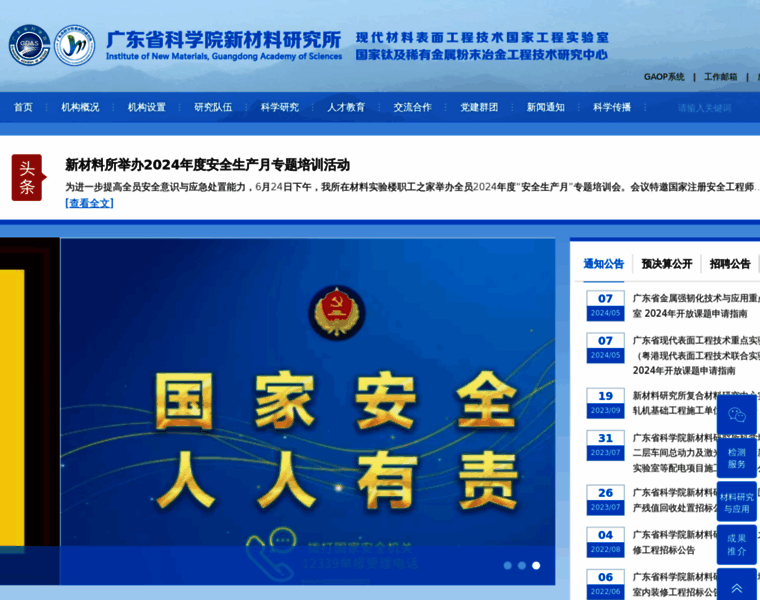 广东省科学院新材料研究所隶属广东省科学院,为其骨干科研院所,公益二类事业单位。研究所承担现代材料表面工程技术国家工程实验室、国家钛及稀有金属粉末冶金工程技术研究中心、广东省现代表面工程技术重点实验室、广东省金属强韧化技术与应用重点实验室等创新平台的建设,开展新材料领域基础性和关键共性技术研究,承担新材料研究开发及工程化验证、新材料领域科技创新平台建设,提供新材料领域的分析测试、产品试制、技术咨询、科技培训、学术交流、人才培养、科学传播等服务。