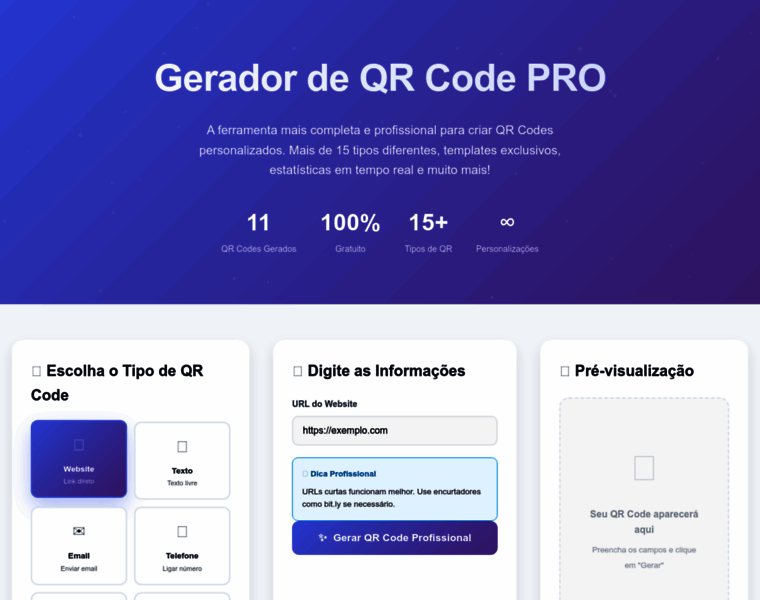 Gerador de QR Code profissional com mais de 15 tipos diferentes. Personalizações avançadas, templates, estatísticas e muito mais. 100% gratuito!