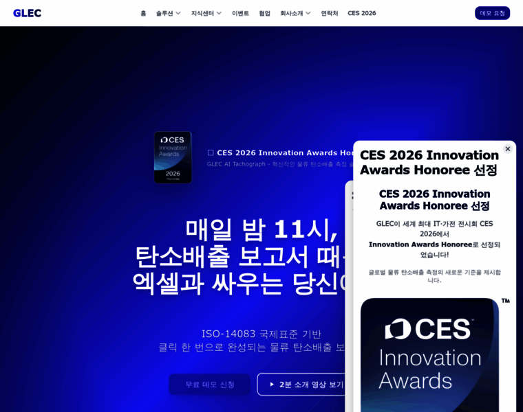 ISO-14083 국제표준 기반 글로벌 물류 탄소배출 측정 솔루션. GLEC DTG, API Console, Cloud 제공. Smart Freight Centre GLEC Tool 인증 진행 중