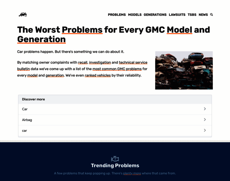 All GMC vehicles will have problems. Shouldn't you at least know which ones? This site uses data collected from owner complaints on carcomplaints.com and combines it with information from NHTSA to tell you which problems to expect and the vehicles you should avoid.