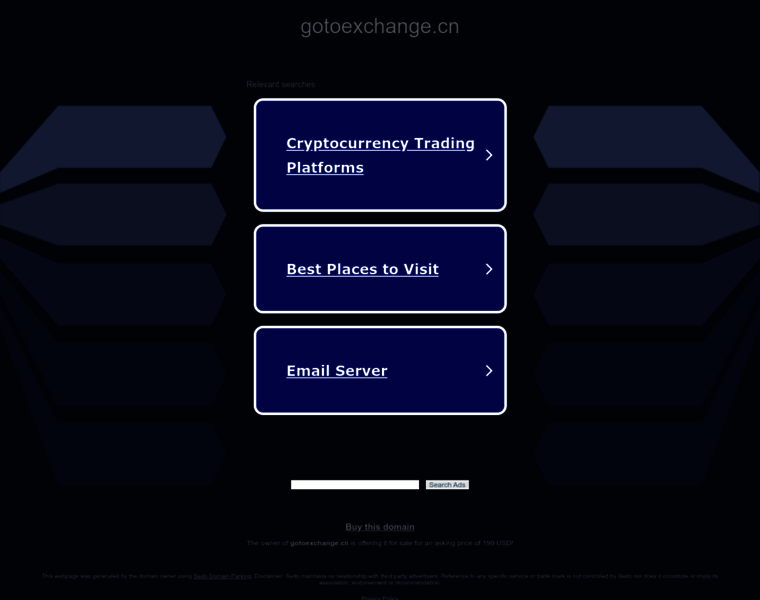 This website is hosted with SEDO GmbH, which reserves the following IP addresses for gotoexchange.cn: 64.190.63.222. Moreover, DNS used with this website include ns1.sedoparking.com, ns2.sedoparking.com.