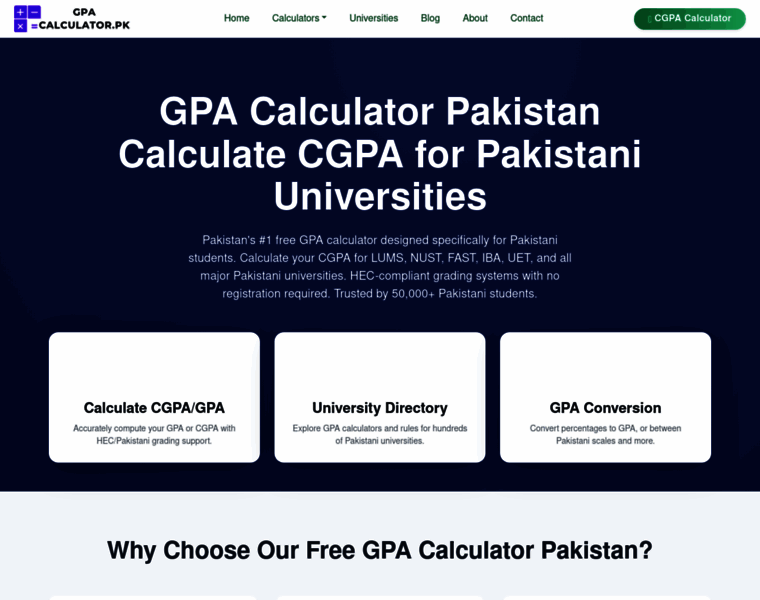 GPA Calculator Pakistan - Calculate CGPA for Pakistani universities including LUMS, NUST, FAST, IBA, UET. Accurate GPA calculator for Pakistani students with HEC-compliant grading systems. No registration required.