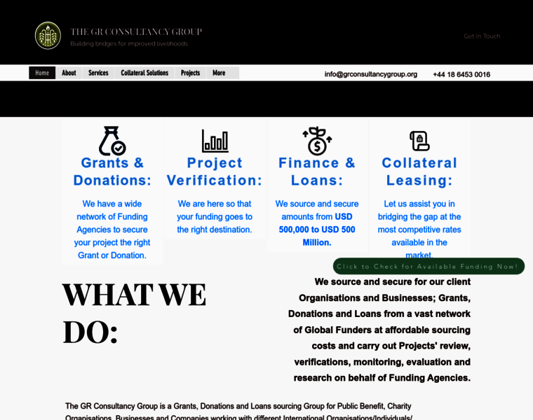 Unlock Funding Opportunities with The GR Consultancy Group. We source Grants, Loans, and Collateral Leasing Arrangements for NGO's, Businesses and Projects Worldwide.