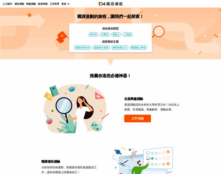 104為你找方向,提供免費性格與興趣測驗、升學與職場最新發展趨勢等資訊,無論你是學生、新鮮人或上班族,都能找到適合自己的探索工具,幫你找到未來職涯發展方向!