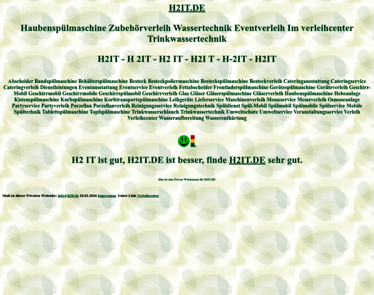 h2it, Besteckverleih, Cateringverleih, Eventverleih, Fettabscheider, Geräteverleih, Geschirr-Mobil, Geschirrmobil, Geschirrmobile, Geschirrverleih, Gläserverleih, Leihgeräte, Kistenspülmaschine, Maschinenverleih, Porzellanverleih, Reinigungsservice, Reinigungstechnik, Spüldienst, Spül-Mobil, Spülmobil, Spülmobile, Spülservice, Mobile Spültechnik, Trinkwassertechnik, Umweltschutz, Umweltservice, Veranstaltungsservice, Verleih, Wasseraufbereitung, ...