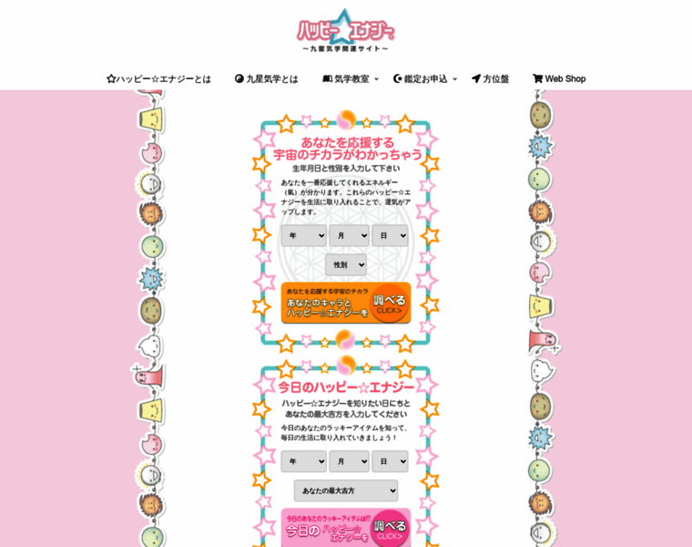 九星気学風水のエネルギーをキャラクター化し、自動鑑定するサイト。「ハッピー☆エナジー」は九星気学の「最大吉方」にあたるもので、自分を一番応援し支え幸せに導いてくれるエネルギーです。