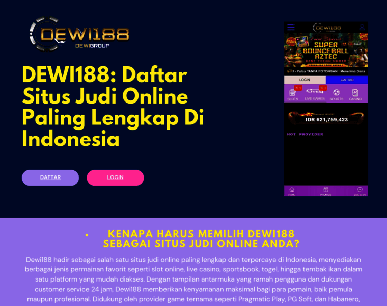 Dewi188 di bangun dengan mekanik anak mudah hadirkan mesin slot pencetak cuan online dengan keamanan yang sangat aman dan memiliki pelayanan terbaik dalam melayani setiap member yang ingin bermain.