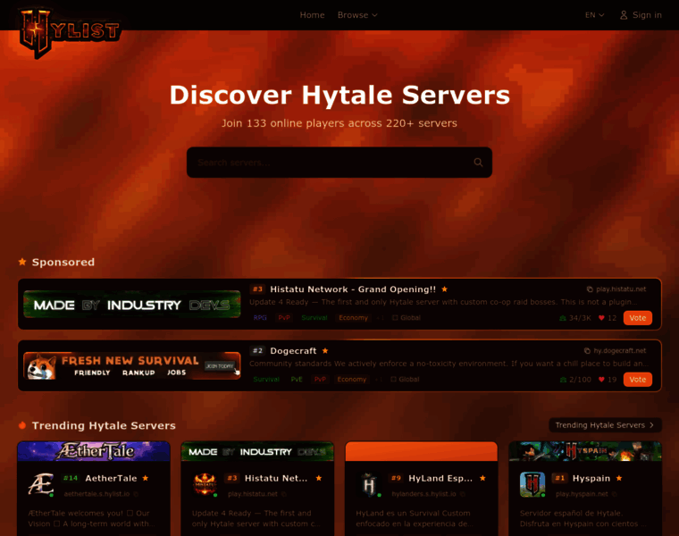 Find the best Hytale servers on Hylist. Browse survival, PvP, creative, and RPG Hytale servers. Vote daily for in-game rewards and join active communities.