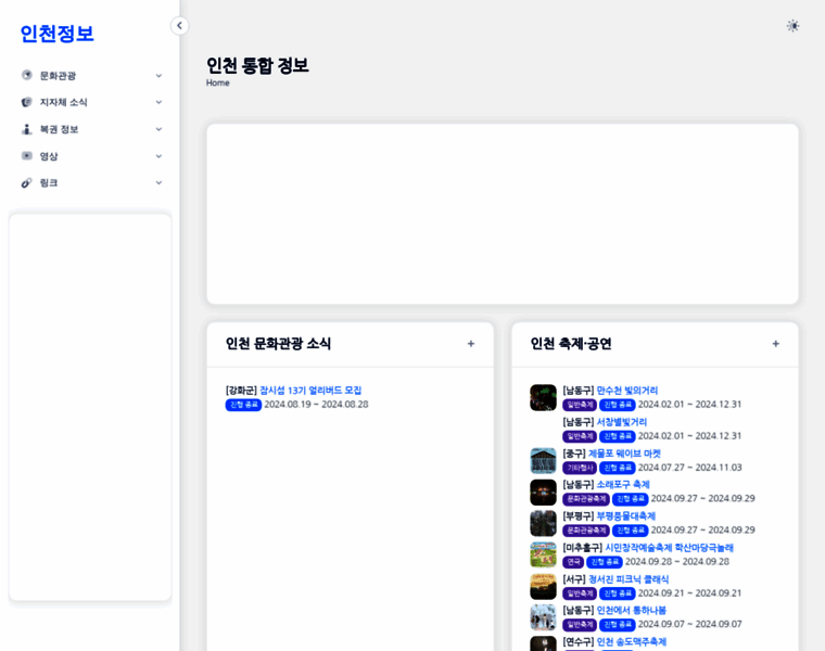 인천 지자체 (중, 동, 미추홀, 연수, 남동, 부평, 계양, 서, 강화, 옹진) 관련 문화관광 소식, 축제·공연, 지자체 소식, 최근 로또 당첨내역, 로또 1등 당첨 판매점 (로또 명당), 지자체 영상 등을 제공합니다.
