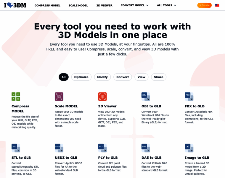 Convert, optimize, and view 3D models instantly in your browser. Support for GLB, OBJ, STL, FBX, USDZ and more. Free tools for 3D printing, game development, and design workflows. No uploads required.