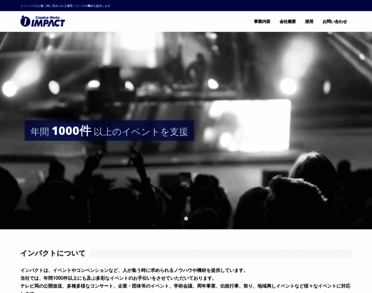 インパクト株式会社は、イベントやコンベンションなど、人が集う時に求められるノウハウや機材を提供ます。年間1000件以上にも及ぶ多彩なイベント・コンベンションの運営や施設運営管理をさせていただいております。公開放送、企業・団体等の社内イベント、学術会議、周年事業、伝統行事、世界遺産コンサート、会場設営、看板制作、同時通訳など様々なご要望に対応します。