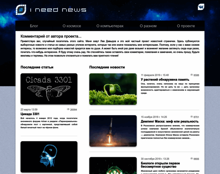 I Need News - Интеллектуальные новости без политики. Увлекательные новости о космосе, компьютерах и просто интересных вещах происходящих в мире.