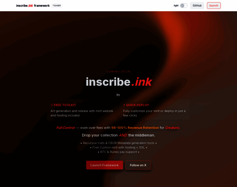 Decentralized non-custodial Ordinal launchpad with full control over design and fees. Customizable mint sites with free hosting & SSL. Inscribe your art on Bitcoin with INK.