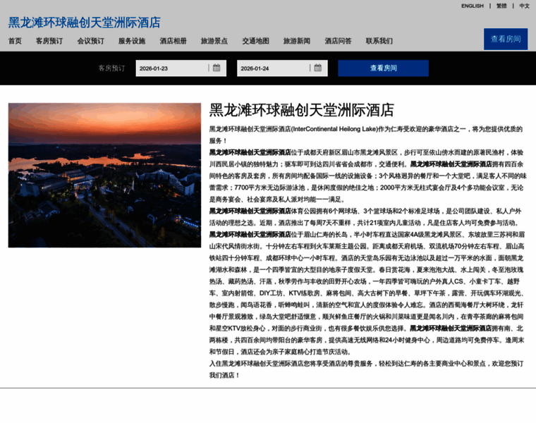 黑龙滩环球融创天堂洲际酒店位于成都天府新区眉山市黑龙滩风景区,步行可至依山傍水而建的原著民渔村,体验川西民居小镇的独特魅。黑龙滩环球融创天堂洲际酒店为您提供黑龙滩环球融创天堂洲际酒店预订、住宿、旅游、娱乐、健身、会议、餐饮、ktv、夜总会、沐足、桑拿等服务。