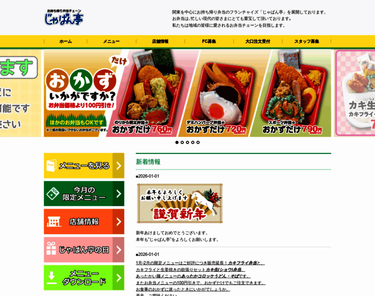 埼玉県を中心に持ち帰りお弁当チェーンを展開するじゃぱん亭の公式サイトです。メニュー、季節限定メニュー、店舗情報、フランチャイズ募集や大量注文受付、採用情報などの情報をお届けします。