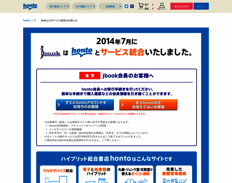honto - jbookとのサービス統合のお知らせ