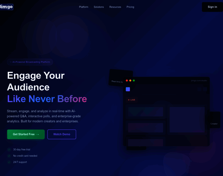 Jimgo helps teams launch modern event broadcasts with landing pages, player experiences, analytics, and scalable live workflows.