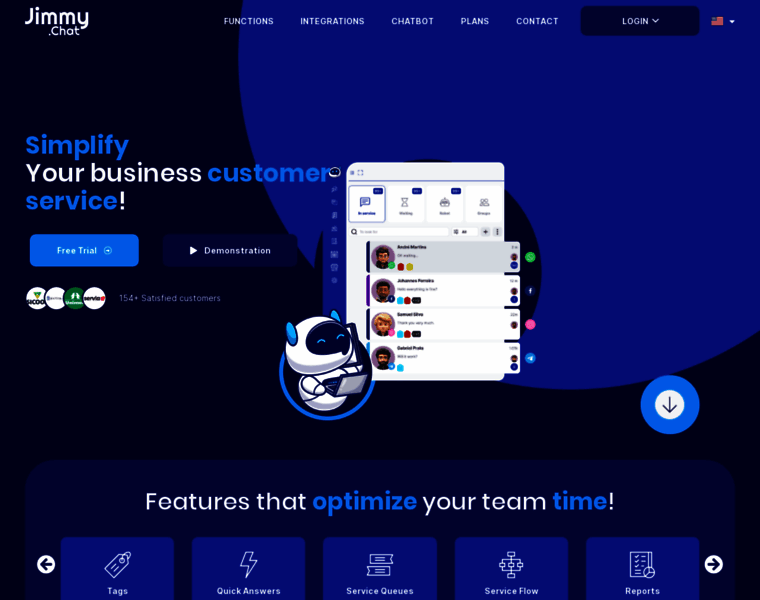Transforme o atendimento ao cliente com um CRM completo e chatbot inteligente integrados ao WhatsApp, Instagram, Facebook e Telegram. Automatize, engaje e fidelize com o JimmyChat. Teste grátis por 7 dias!