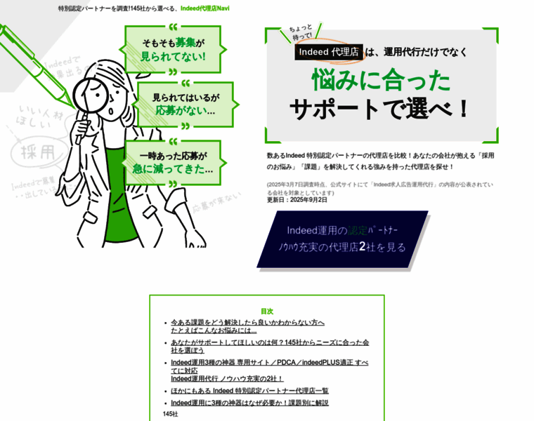 Indeed有料求人広告枠の運用代行を行うIndeed代理店。特別認定されているゴールドパートナー、シルバーパートナーから運用代行情報を公表している145社を徹底比較!単にIndeedの運用代行だけでなく、現在抱えている採用のお悩みを個々に解決するサポートにも対応した、頼れる代理店を探せます。