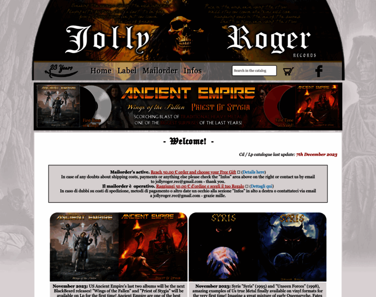 JOLLY ROGER RECORDS Italian Heavy Metal Label & Mailorder. 7.500 Titles, Lp, Cd, Rarities, Import. Shipping worldwide !!!
