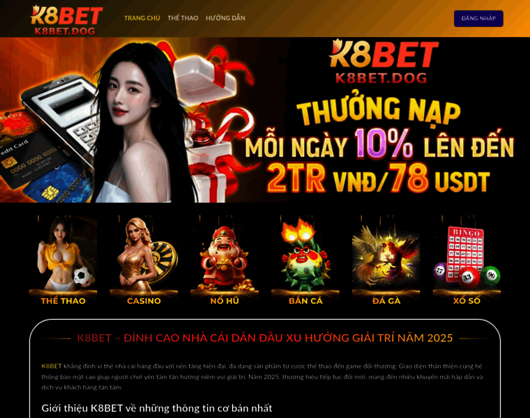 K8BET là nhà cái đỉnh cao dẫn đầu xu hướng giải trí năm 2025, mang đến trải nghiệm cược thể thao và game đổi thưởng hấp dẫn, uy tín và chuyên nghiệp.