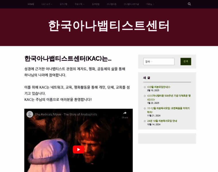 성경에 근거한 아나뱁티스트 관점의 제자도, 평화, 공동체의 삶을 통해하나님의 나라에 참여합니다. 이를 위해 KAC는 네트워크, 교육, 평화활동을 통해 개인, 단체, 교회를 섬기고 있습니다.KAC는 주님의 이름으로 여러분을 환영합니다! https://www.youtube.com/watch?v=4sD9fjgc3b4&t=24s 이 영상은 아나뱁티스트의 역사 가운데 가장 심한 핍박을 받은 16세기 마이클 새틀러의 인생을 영화로 제작한 것입니다. 그는 슐라이트하임 고백서를 만드는 일을 이끈 초기 아나뱁티스트 운동의 리더였습니다. 그가…