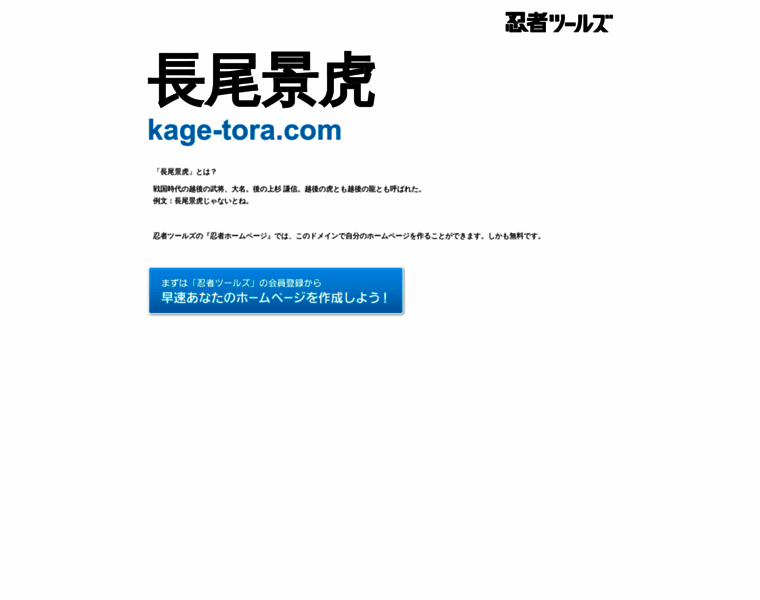kage-tora.comドメインであなただけのホームページを作ってみませんか?『忍者ツールズ』なら無料であなたのホームページを作ることができます。
