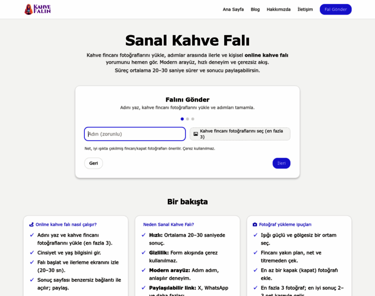 Sanal kahve falı ile geleceğini keşfet! Fotoğraf yükle, anında yorum al. Eğlenceli, güvenilir ve hızlı kahve falı deneyimini yaşa.