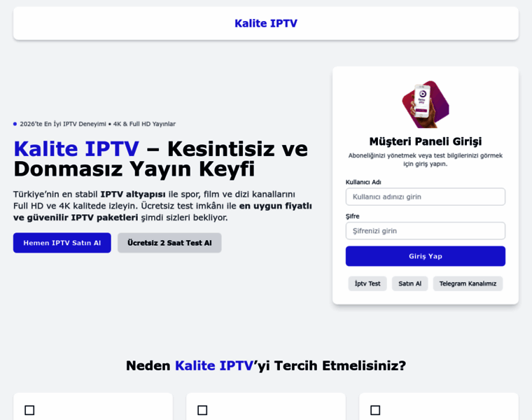IPTV hizmeti satın almak isteyenler için en iyi modelleri ve uygun fiyatlarıyla IPTV satın al seçeneklerini keşfedin. Test yayını ile hizmeti denemenize imkan tanıyoruz, hiçbir ücret yok, taahhüt yok.