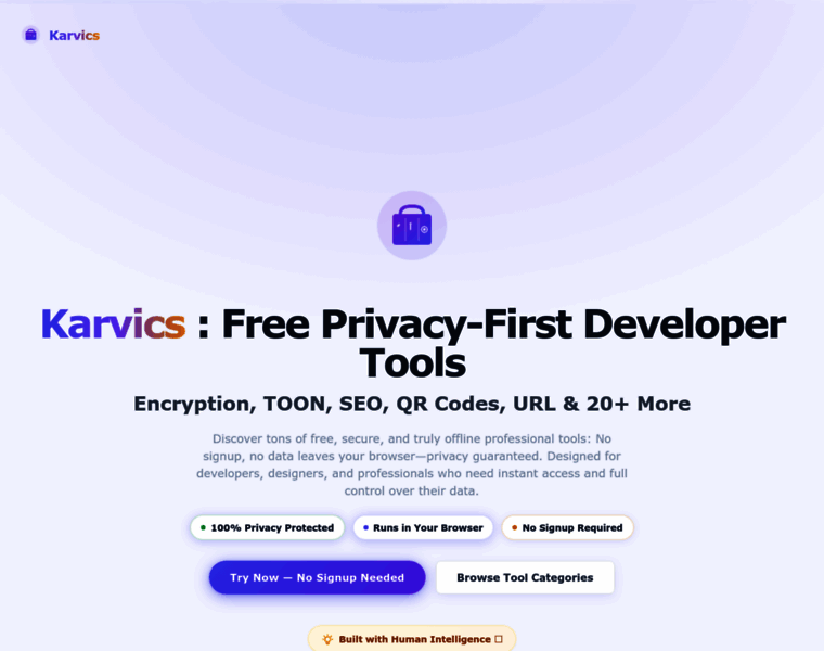 Karvics offers free, privacy-focused online tools for developers covering PDF, crypto, SEO, text, and TOON with instant access, no signup.
