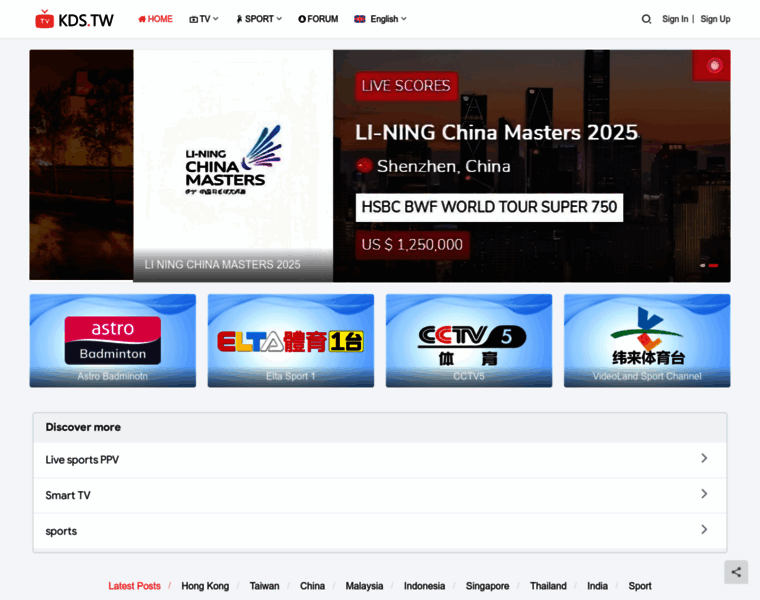 KDS.TW (星火直播) brings you free HD live streaming of badminton matches, sports, and Chinese TV channels—CCTV5 Sports, Hunan TV, Phoenix TV, Taiwan TV, and TVB Jade.
