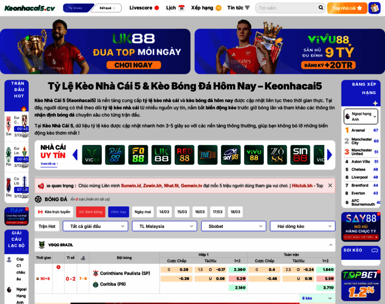 Kèo Nhà Cái 5 (Keonhacai5) là nền tảng cung cấp tỷ lệ Kèo Nhà Cái, soi kèo bóng đá, nhận định bóng đá, lịch thi đấu và kết quả bóng đá hôm nay.