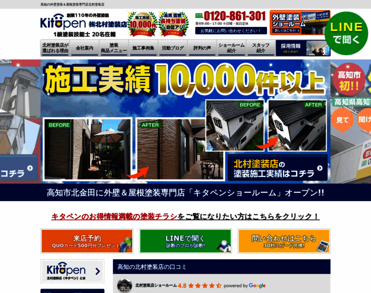 高知県高知市で外壁塗装、屋根塗装、防水工事なら、創業110年の北村塗装店 北金田キタペンショールームへ。施工実績1万件の地域No1実績、1級塗装技能士20名在籍で品質で評判の塗装店。【電話:0120-861-301!無料見積、外壁劣化・雨漏診断、実施中】