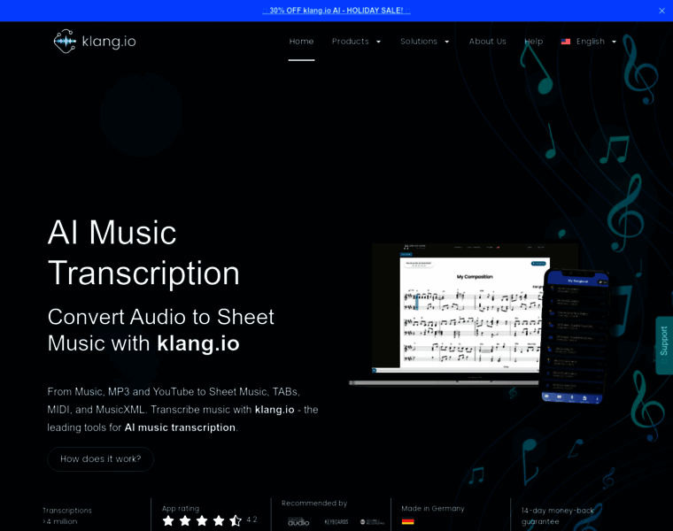 Klangio AI turns Music into Notes. Let the different apps transcribe your Audio and YouTube into Sheet Music, MIDI and MusicXML.