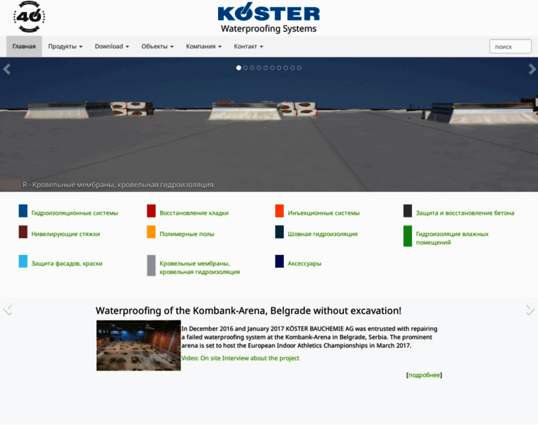 КЁСТЕР БАУХЕМИ АГ более 30 лет специализируется на разработке и производстве материалов и систем для гидроизоляции. Эти продукты защищают сооружения по всему миру на протяжении многих лет. Фирма КЁСТЕР предлагает широкую программу эффективных продуктов и систем, гарантирующих надежную гидроизоляцию от подвала до кровли, от жилого дома до гидротехнических сооружений.