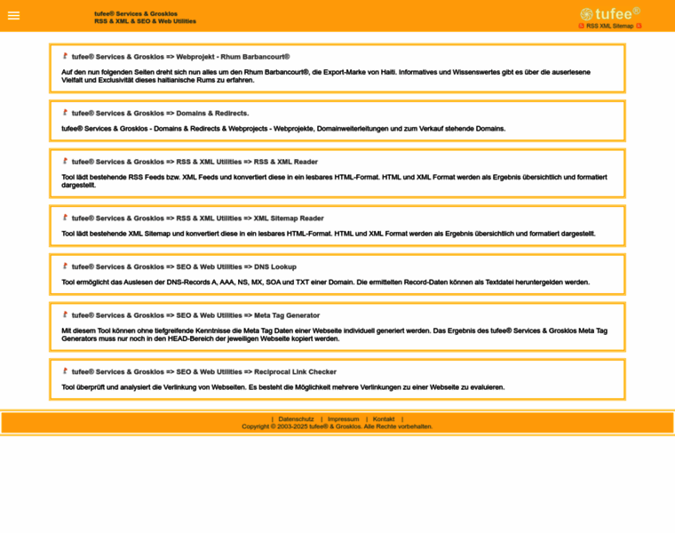 tufee® Services & Grosklos bietet Ihnen Online RSS & XML Utilities und Online SEO & Web Utilities zum Erstellen oder zum Optimieren Ihrer Webseite an.