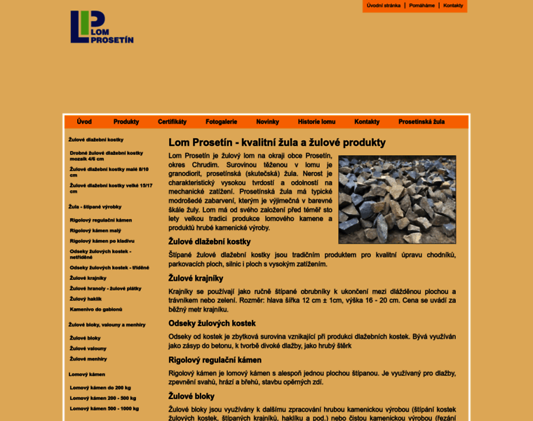 Lom Proset?n, okres Chrudim, n? sortiment: ?ulov? ?t?pan? krajn?k, rigolov? k?men, ?ulov? bloky, lomov? k?men, hrub? kamenick? v?roba, ?ulov? kostky, ?ulov? dla?ba, z?hozov? k?men, ?t?rk, frakce ?ulov? drti
