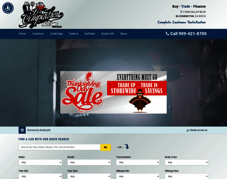 Used cars for sale in BLOOMINGTON, CA. LOS COMPADRES AUTO SALES offers the best deals on auto finance, Get Pre-Approved Today! Browse from a quality selection of used cars and trucks, read customer reviews and even get a trade valuation. We are here to help get you financed on your next car or truck!