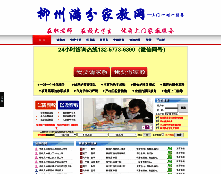 柳州满分家教网(一对一上门家教电话13257736390)免费提供优秀大学生,公立在职老师,专职老师等家教服务,实名认证教员,多年品牌经验,成功辅导上万名学生,欢迎致电!