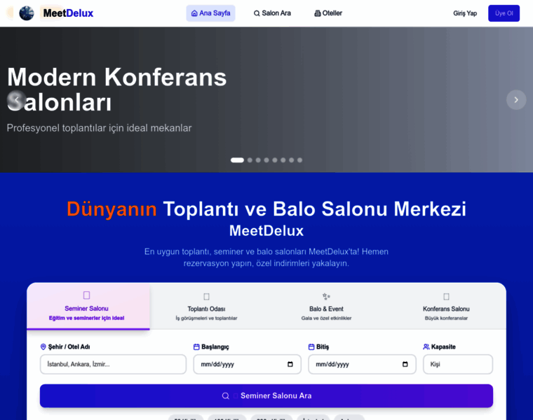 Türkiye'nin en prestijli otellerinde seminer salonu, toplantı salonu ve konferans salonu rezervasyonu. Online rezervasyon ve güvenli ödeme. MeetDelux ile işletmeniz için ideal mekanı bulun.
