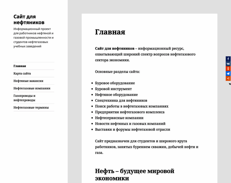 Сайт для нефтяников – информационный ресурс, охватывающий широкий спектр вопросов нефтегазового сектора экономики.Основные разделы сайта:Буровое оборудование Буровой инструмент Нефтяное оборудование Спецтехника для нефтяников Поиск работы в нефтегазовых компаниях Предприятия нефтегазового комплекса Нефтесервисные компании Новости нефтяных и газовых компаний Выставки и форумы нефтегазовой отрасли Сайт предназначен для студентов и широкого круга ра...