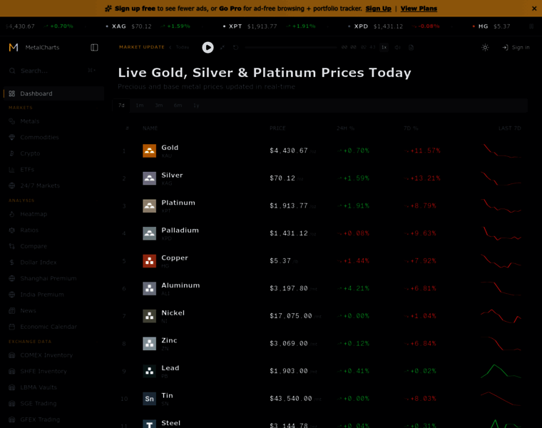 Track live gold, silver, platinum, palladium, copper, and aluminum prices. Real-time charts, price alerts, and market analysis for precious and base metals. Updated in real-time.