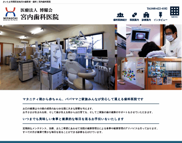 さいたま市西区佐知川にある歯医者「医療法人 博耀会 宮内歯科医院」公式サイト。お子さまからご年配の方まで皆さまのお役に立てるよう、幅広く診療しています。審美治療、矯正歯科、インプラント、訪問歯科診療も可能です。治療は、一時しのぎではなく、お口全体の状態を改善して長持ちさせることを目指します。キッズスペース、駐車場あり。